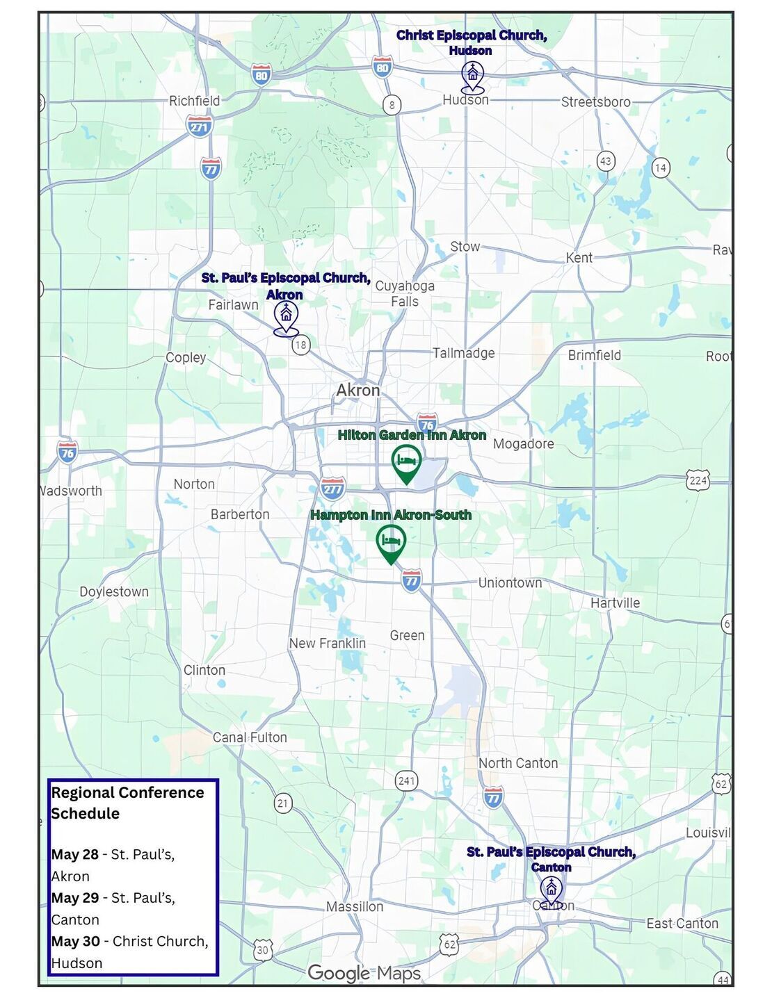 Our Regional Gathering is scheduled for the Akron/Canton region, May 28–30, 2026. The event is being held at three parishes: Thursday at St. Paul's, Akron; Friday at St. Paul's, Canton; and Saturday at Christ Church, Hudson. All are welcome to attend. Participants are welcome to join the entire gathering, or attend only one or two sessions. We will host another Regional Gathering, in a new location, in 2027.